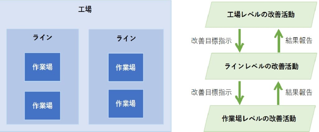 の3階層で行われるものとし、上位階層の改善目標を下位階層に伝え、下位階層の実現可能性を上位にフィードバックする階層型の改善モデル とします(図1)。