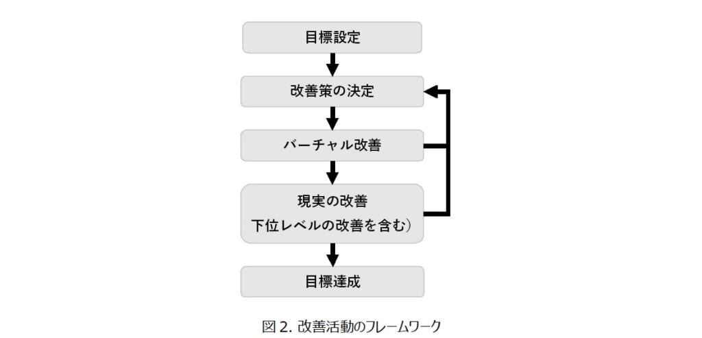そして、各レベルの改善活動を、改善活動のフレームワーク(図2)に沿って行います。ポイントは、改善策を決定した後で生産シミュレーションを使ったバーチャル改善を行い、成功率が高い改善策のみを現実の改善で実行することです。